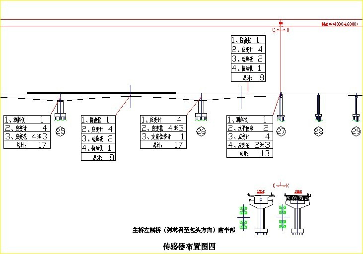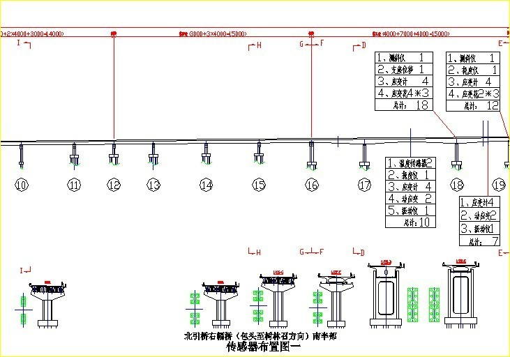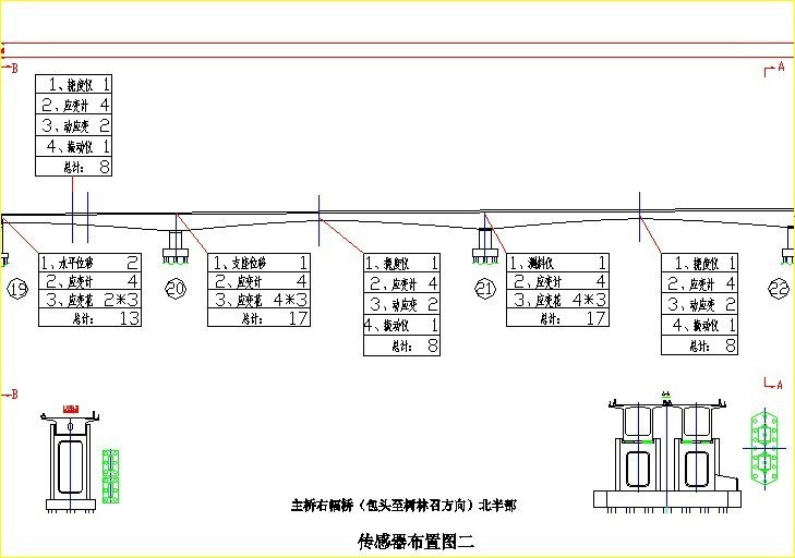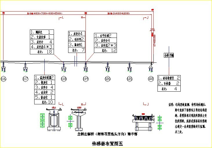 黄河大桥健康监测部位截面及传感器布置数量如传感器布置图一至传感器布置图五
