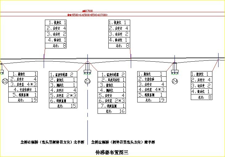 综上,包树高速黄河大桥健康监测系统的监测部位为:北引桥(85m+6×150m+85m)右幅南半部、主桥(85m+6×150m+85m)右幅北半部、主桥(85m+6×150m+85m)左幅南半部、南引桥(85m+6×150m+85m)左幅南半部,共计四个全面、典型的监测部位。监测截面涉及南桥头主线和以上四个监测部位共27个监测区域截面,共计17个监测项目、12种传感器、331个(套)传感器和监测点。
