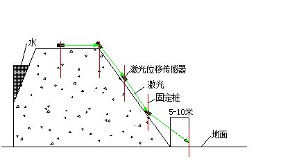 根据坝的长短至少选择2~6个监测剖面。一般在最大坝高处、地基地形地质变化较大处均应布置监测剖面,在每个剖面最上面安装一个激光位移传感器。根据坝的高矮坝在坝坡表面从上到下均匀设置4~6个滑坡监测点,在离坡脚5-10米或更远处设置一个不动点,然后在每个监测点和不动点打固定桩,深度根据坝体进行调整,在每个固定桩之间安装位移传感器。通过固定点和不动点之间的位移变化监测整个坝体的位移。